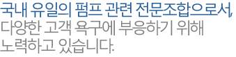한국펌프조합은 2004년 11월 26일 산업자원부 중소기업청으로부터 설립인가를 받은 국내유일의 펌프관련 전문조합으로서, 펌프 및 관련부품에 대한 품질향상을 위한 기술지도와 더불어 경영지도 등을 하고 있으며 펌프에 대한 단체표준 규격을 제정하여 제품 표준화와 품질고급화를 달성하고 다양한 고객욕구에 부응하기 위해 최선의 노력을 경주하고 있습니다.